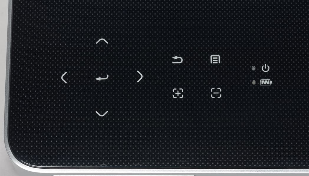 Фокусировка осложнена тем, что сенсорные кнопки не находятся на ощупь (а смотреть нужно на экран) и тем, что ИК-приемник только сзади, поэтому, стоя близко к экрану, с пульта настроить фокус не получится. Сдвиг защитной шторки, к сожалению, не привязан к включению и выключению проектора, а это было бы так удобно.
