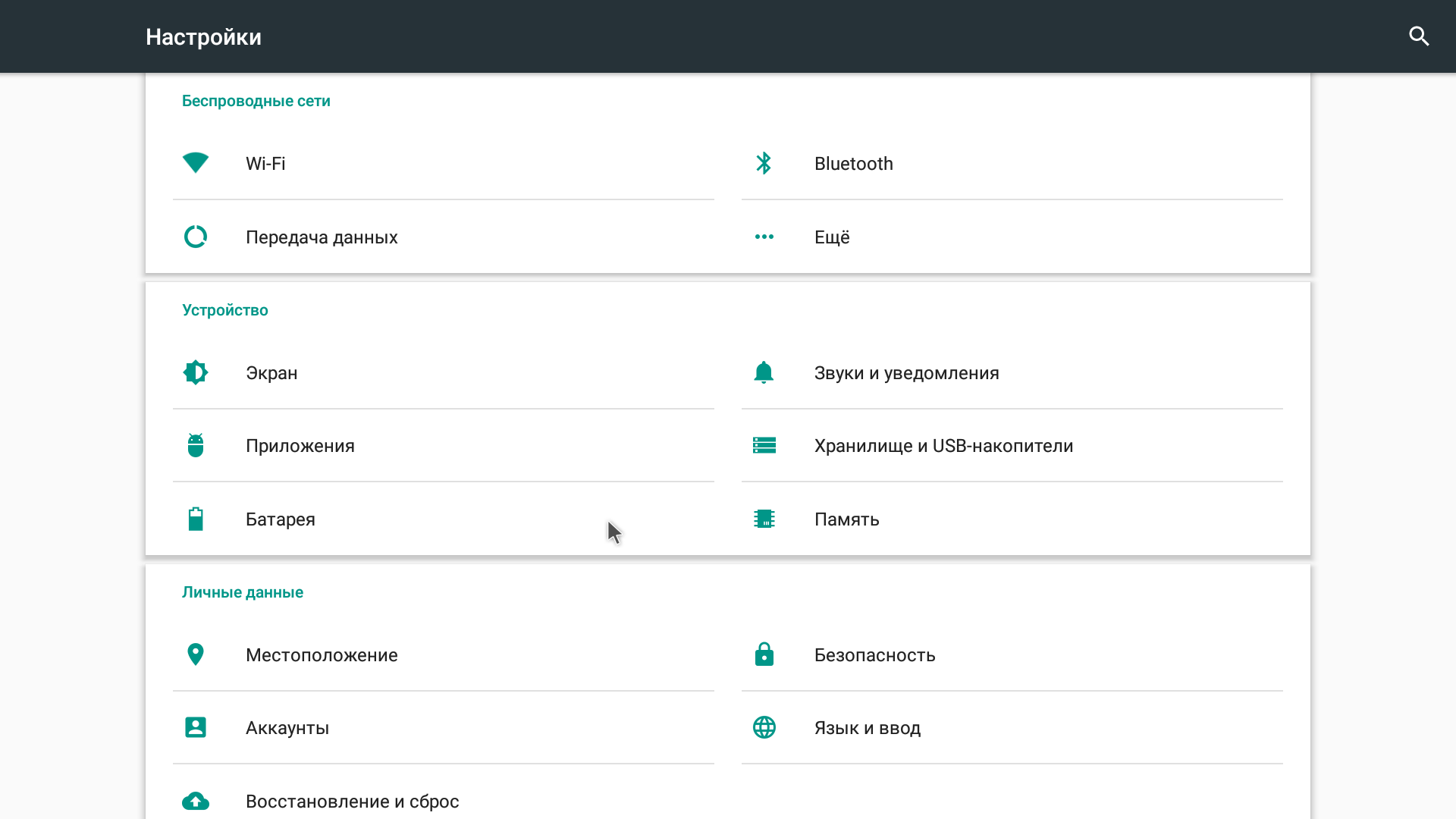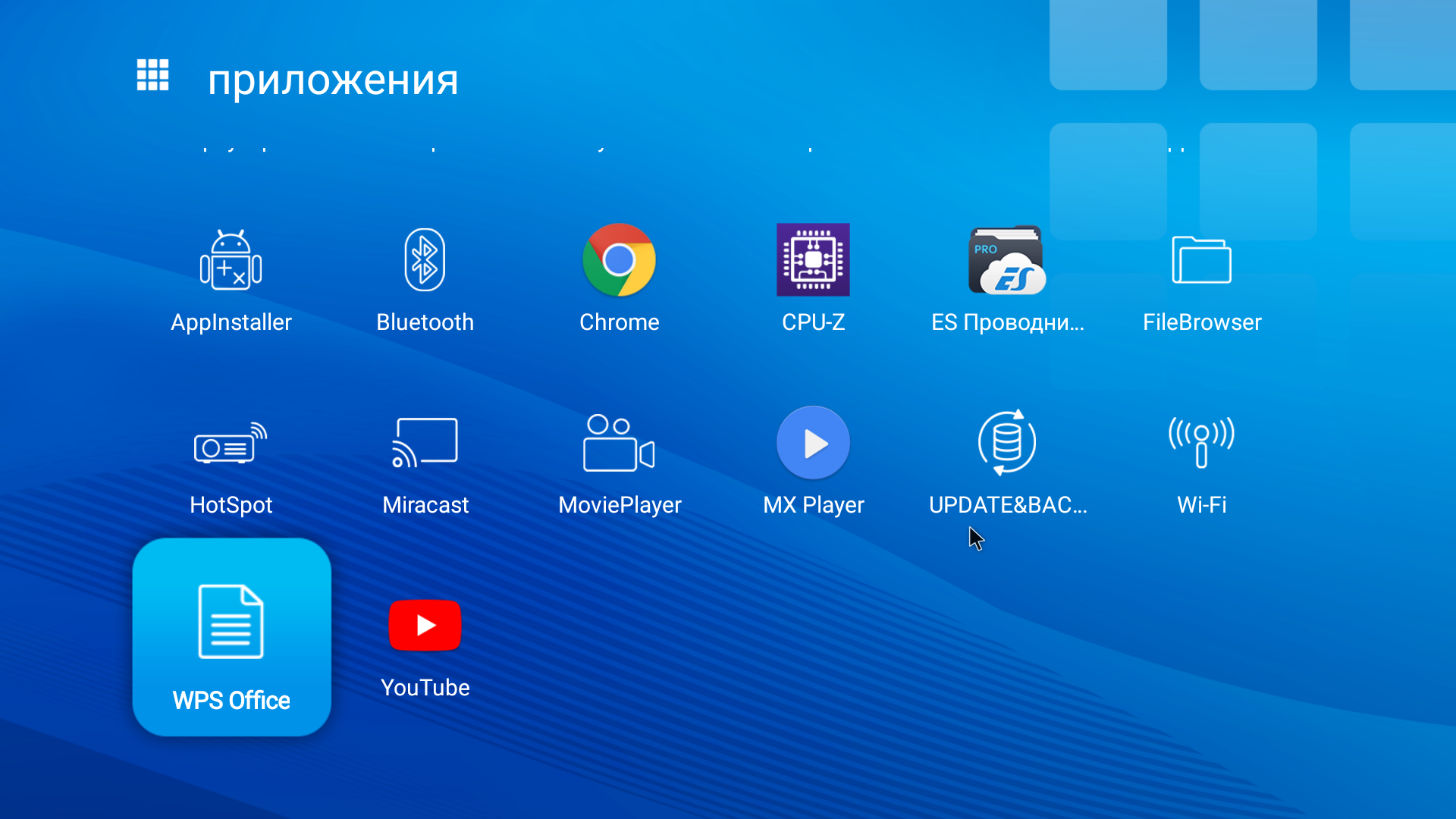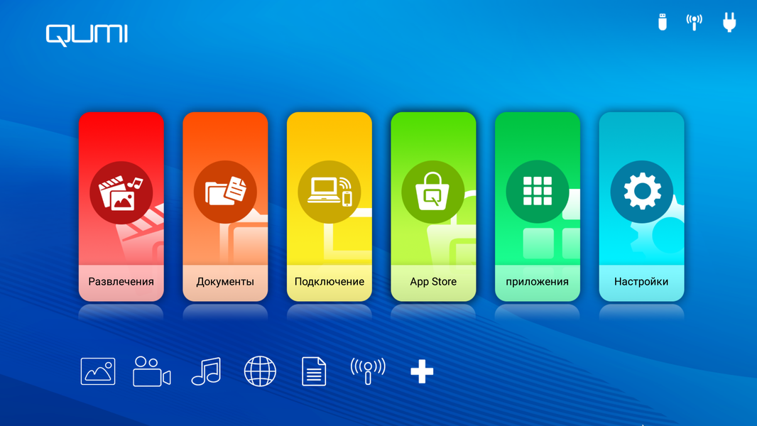 Программной платформой для реализации мультимедийной функциональности служит операционная система Android 6.0. Программная оболочка — надстройка над стандартной системной оболочкой — простая, она упрощает пользователю запуск установленных программ. На главной странице значки вверху подсказывают, что подключено к проектору, какие беспроводные интерфейсы активны и текущий вид питания — от сети или от аккумулятора. Большие вертикальные прямоугольники со скругленными углами ведут на списки со значками программ в соответствующих категориях или сразу запускают приложение (магазин приложений или настройки системы).