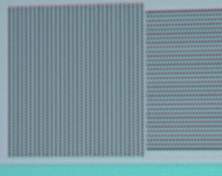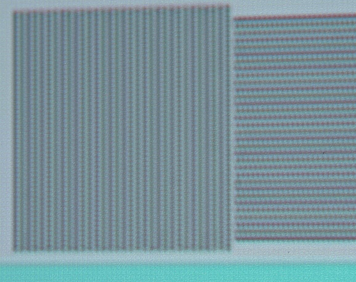 Конечно по микроконтрасту и по четкости получаемое изображение хуже, чем при использовании настоящей матрицы 1920 на 1080 пикселей, но различить 1080 линий можно, вот фрагмент миры с полосками через пиксель:
