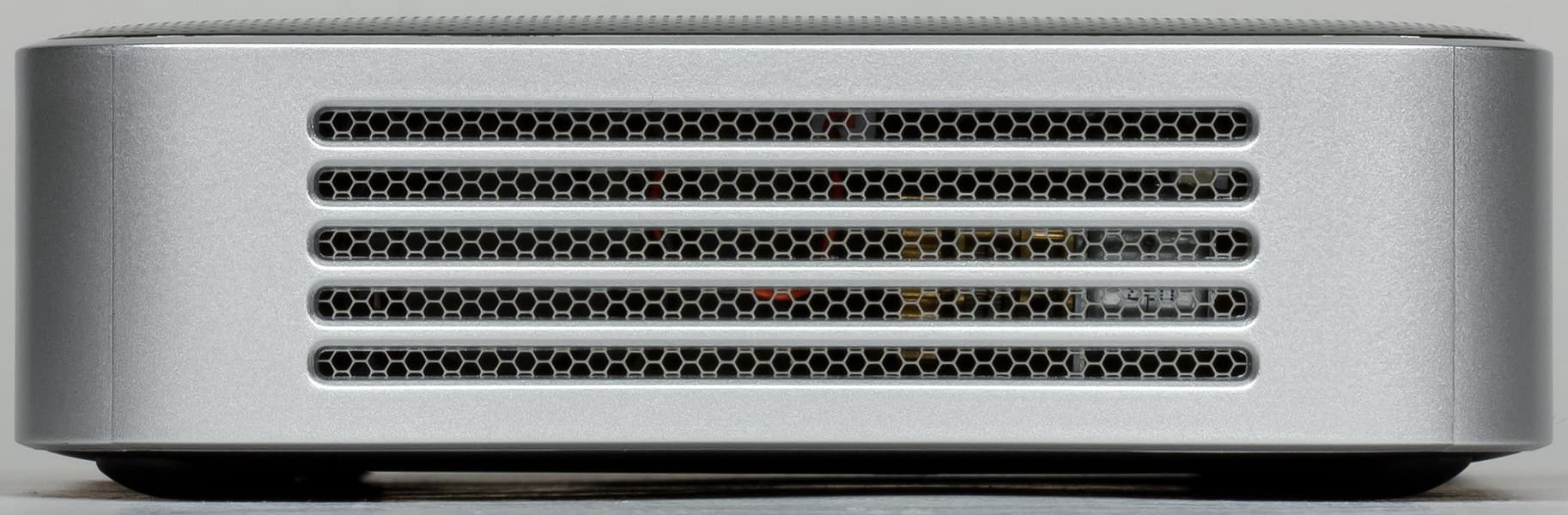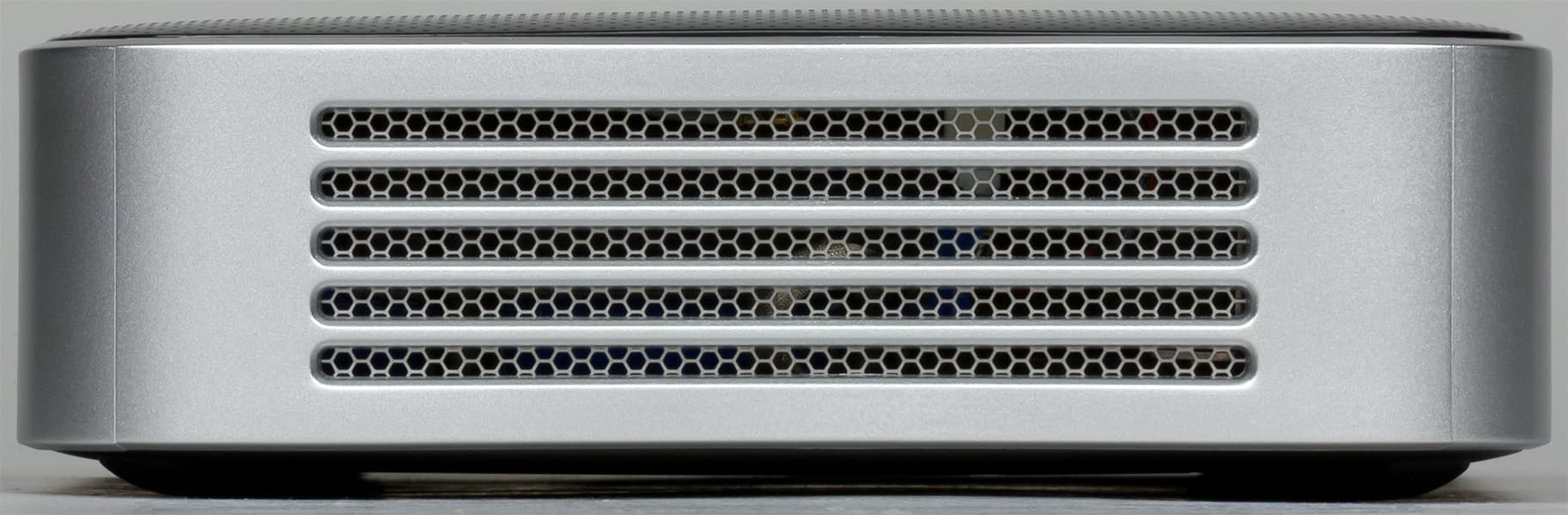 На задней панели — еще одна вентиляционная решетка, окошко единственного ИК-приемника, интерфейсные разъемы, отверстие для доступа к кнопке сброса, разъем питания и кнопка питания.