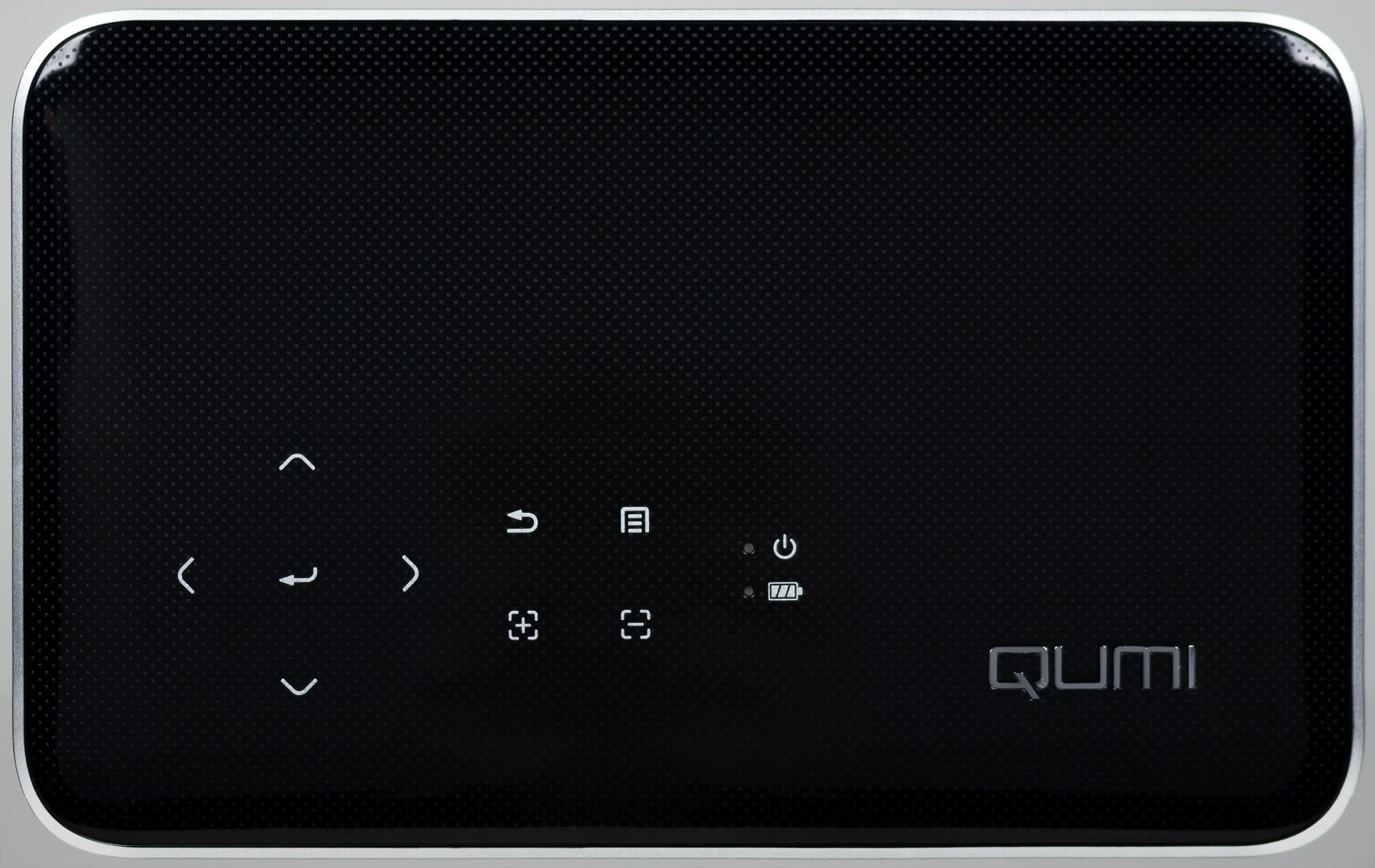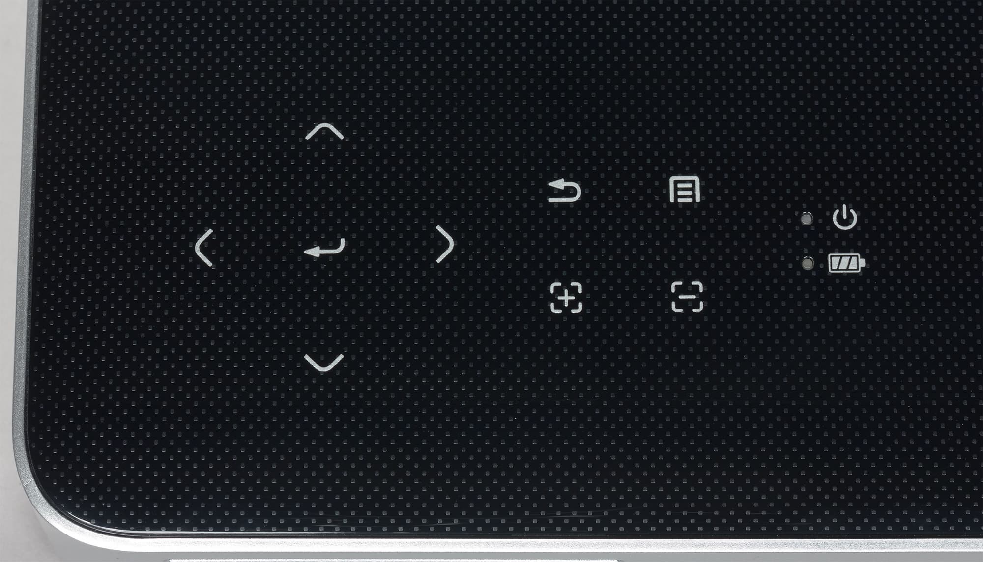 Корпус проектора изготовлен из пластика: верхняя панель зеркально-гладкая с рельефным узором в виде мелких пупырышков, по периметру — матовое серебристое покрытие, а днище — черное и матовое.