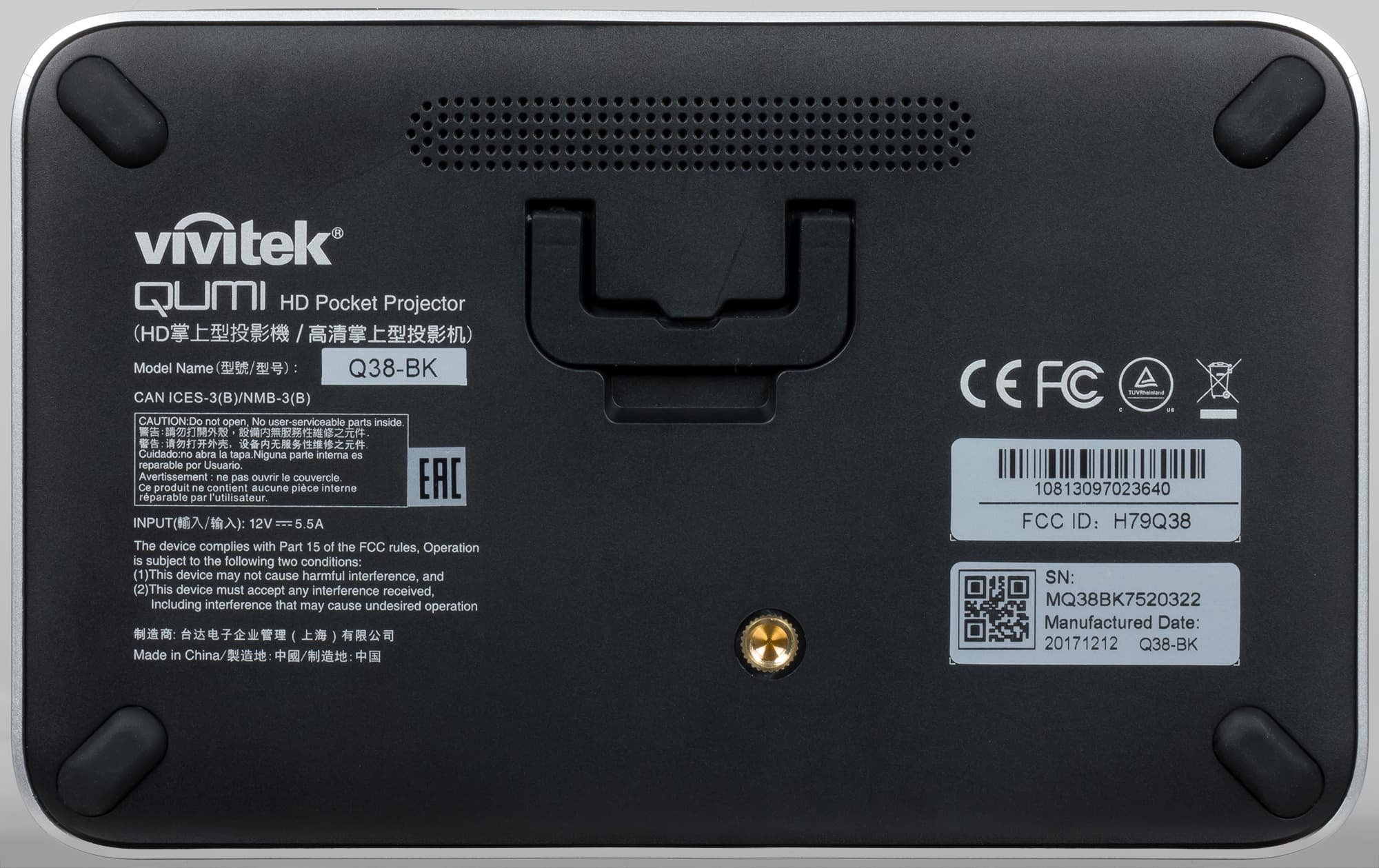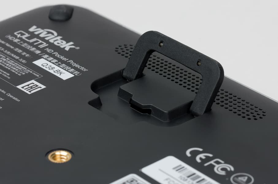 На днище в углах можно обнаружить невысокие резиновые ножки, в центре — штативное гнездо (металлическая втулка), соответственно, как вариант проектор можно устанавливать на фотоштатив, небольшую решетку, за которой, как сказано в руководстве, находятся громкоговорители, и откидную обрезиненную ножку.