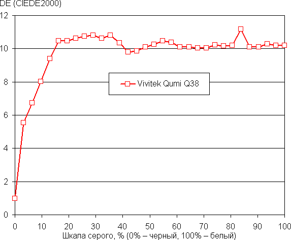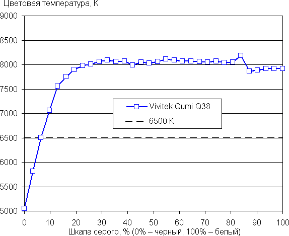Близкий к черному диапазон можно не учитывать, так как в нем цветопередача не так важна, а погрешность измерения цветовых характеристик высокая. Цветовой баланс средний, так как цветовая температура существенно выше стандартных 6500 К, однако отклонение от спектра абсолютно черного тела (ΔE) невысокое, порядка 10 единиц, при этом ΔE и цветовая температура мало изменяются на всей имеющей значение части шкалы серого, что благоприятно сказывается на субъективном восприятии цветового баланса.