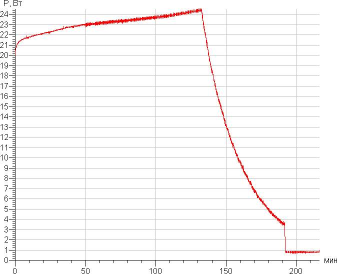 При работе от встроенного аккумулятора (включены Wi-Fi и Bluetooth) проектор смог показывать картинку в течение 1 ч 50 мин, что близко к заявляемой производителем автономности в 2 ч. На полную зарядку аккумулятора проектору требуется 3 ч 12 мин, если он находится в режиме ожидания. Зависимость потребления от времени при зарядке: