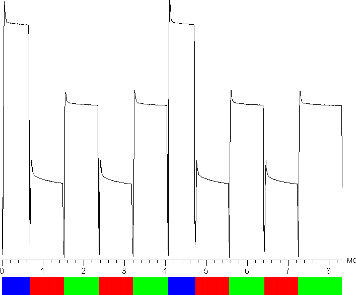 В отличие от типичного одночипового DLP-проектора, в данном проекторе нет вращающегося светофильтра, вместо него и лампы используются три светодиодных излучателя — красный, зеленый и синий, — включающиеся последовательно. Анализ зависимостей яркости от времени показал, что частота чередования цветов составляет 480 Гц для красного и зеленого цвета и 240 Гц для синего. Меньшая частота условно соответствует 4-скоростному светофильтру, А большая — даже 8-скоростному, поэтому эффект «радуги» выражен умеренно. На графике ниже приведена зависимость яркости (вертикальная ось) от времени (горизонтальная ось) при выводе белого поля. Цветные прямоугольники под шкалой показывают периоды включения светодиодов соответствующих цветов.