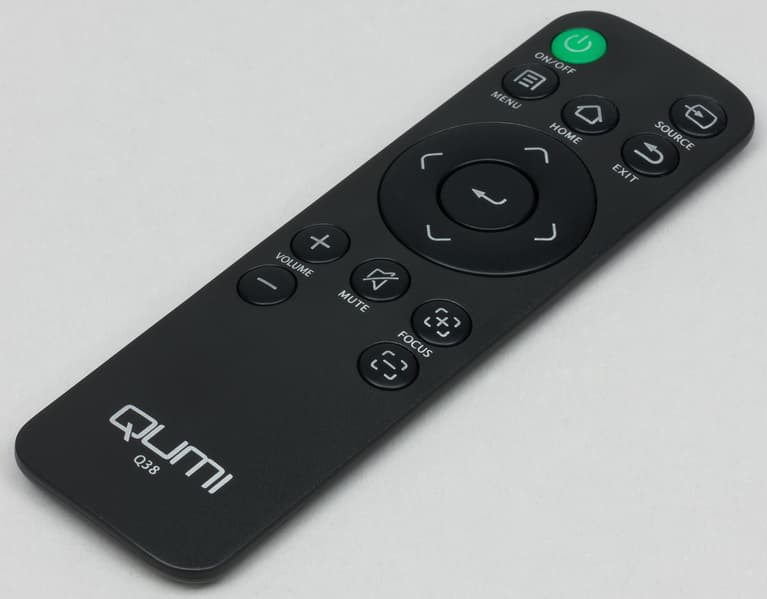 Пульт небольшой (126×38×8 мм). Его корпус изготовлен из черного пластика с матовой поверхностью. Источниками питания служит один элемент типа CR2025. Кнопки изготовлены из резиноподобного материала. Обозначения кнопок достаточно контрастные. Функции координатного ввода, например гироскопической «мыши», у штатного пульта нет. Ограниченные в случае такого «умного» проектора возможности пульта можно компенсировать, подключив к проектору настоящие клавиатуру и «мышь». Поддерживается прокрутка колесиком. Нажатие на правую кнопку «мыши» соответствует отмене действия или возврату назад. Задержка перемещения курсора «мыши» относительно движения самой «мышью» не очень большая, но чувствуется. Для подключенной клавиатуры раскладка выбирается комбинацией клавиш Ctrl+Пробел. Поддерживаются некоторые быстрые клавиши из основного и дополнительного набора (например, возврат/отмена, переход на главную страницу, вызов списка последних программ, регулировка громкости, пауза/воспроизведение, запись снимков с экрана и т. д.), но неправильно работает клавиша Ввод. По Bluetooth не получилось подключить клавиатуру и джойстик от PS4 (он не заработал и по USB), но удалось подключить мышь. Вообще, для активной работы с мультимедийными функциями и с приложениями очень рекомендуется подключить хотя бы мышь, и, возможно, лучше в гироскопическом варианте.