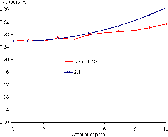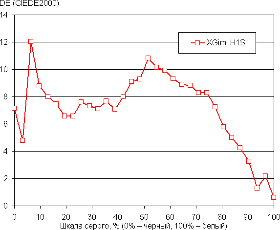 Близкий к черному диапазон можно не учитывать, так как в нем цветопередача не так важна, а погрешность измерения цветовых характеристик высокая. Вариация цветового тона на шкале серого относительно большая, что в общем случае для DLP-проекторов нетипично.
