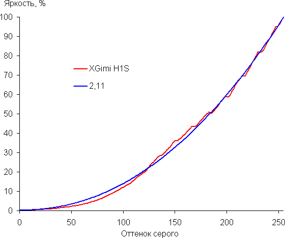 Аппроксимация полученной по 256 точкам гамма-кривой дала значение показателя 2,11, что немного меньше стандартного значения 2,2, при этом реальная гамма-кривая заметно отклоняется от аппроксимирующей функции: