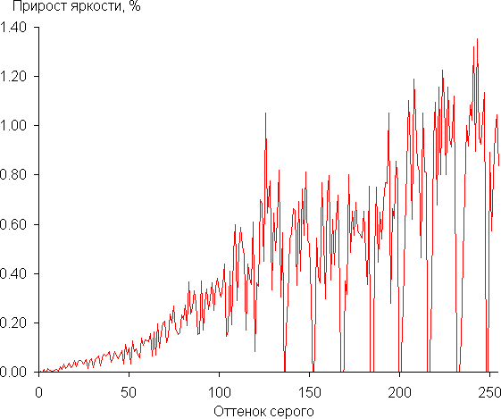 Для оценки характера роста яркости на шкале серого мы измерили яркость 256 оттенков серого (от 0, 0, 0 до 255, 255, 255). График ниже показывает прирост (не абсолютное значение!) яркости между соседними полутонами: