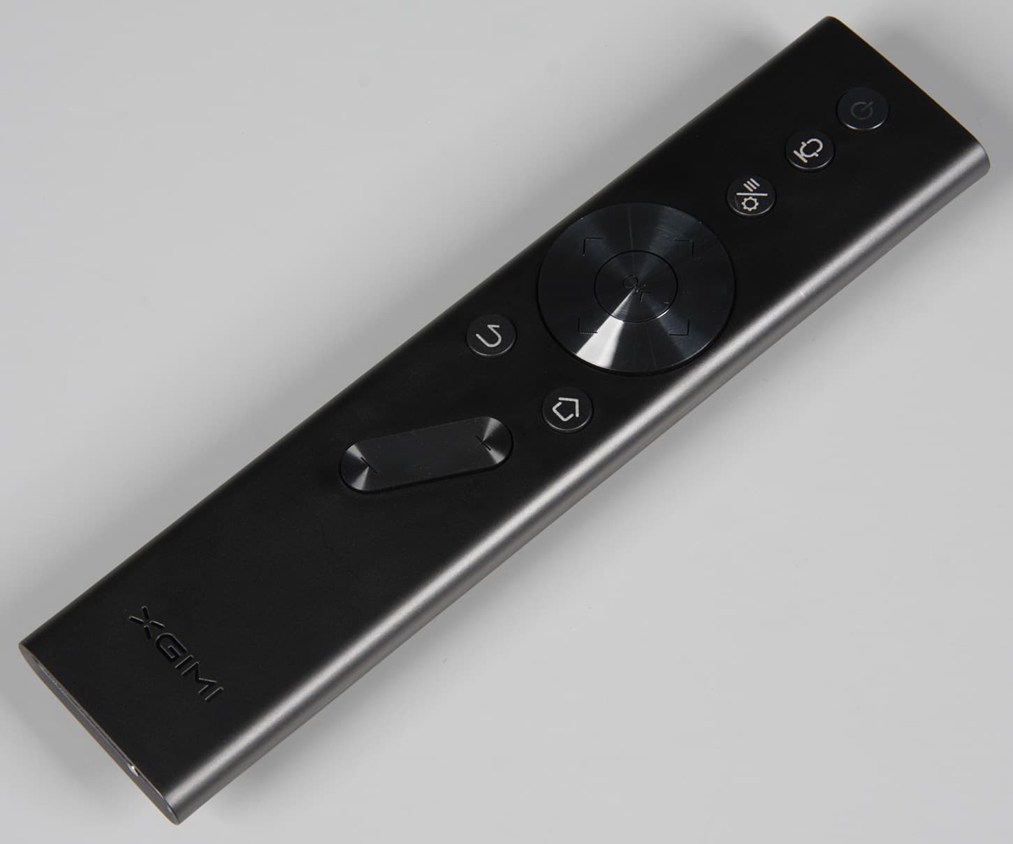 Корпус пульта изготовлен из черного пластика с матовой поверхностью. Источниками питания служат два элемента типа ААА. Обозначения ряда кнопок контрастные, на других значки просто выдавлены, но функции этих кнопок понятны, исходя из их расположения и формы. При нажатии кнопки негромко щелкают. Как уже было написано, подключается пульт по Bluetooth. Для спаривания с проектором пульт необходимо близко поднести к проектору и удерживать нажатыми кнопки «Назад» и «Домой». На подключенном пульте постоянно и неярко светится значок на кнопке питания. Движковый переключатель на торце пульта меняет функцию кнопки-качалки — изменение громкости или фокусировка.