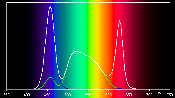 Ниже приведены спектры для белого поля (белая линия), наложенные на спектры красного, зеленого и синего полей (линии соответствующих цветов) для трех режимов: