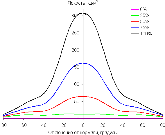 Отметим плавное, но все же относительно быстрое уменьшение яркости при отклонении от перпендикуляра к экрану во всех трех направлениях, при этом графики яркости полутонов не пересекаются во всем диапазоне измеряемых углов. По скорости снижения яркости углы обзора относительно узкие. Яркость черного поля при отклонении от перпендикуляра к экрану возрастает, но всего до примерно 0,55% от максимальной яркости белого поля. Это средний результат для данного типа матриц. Контрастность в диапазоне углов ±82° для двух направлений значительно превышает 10:1 и только для диагонального направления она ниже, но все же не опускается за эту отметку.