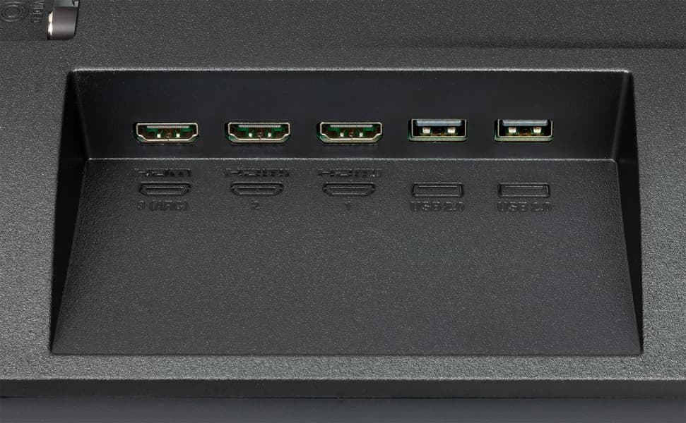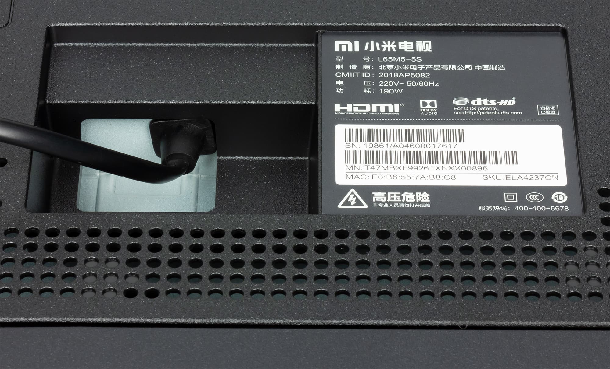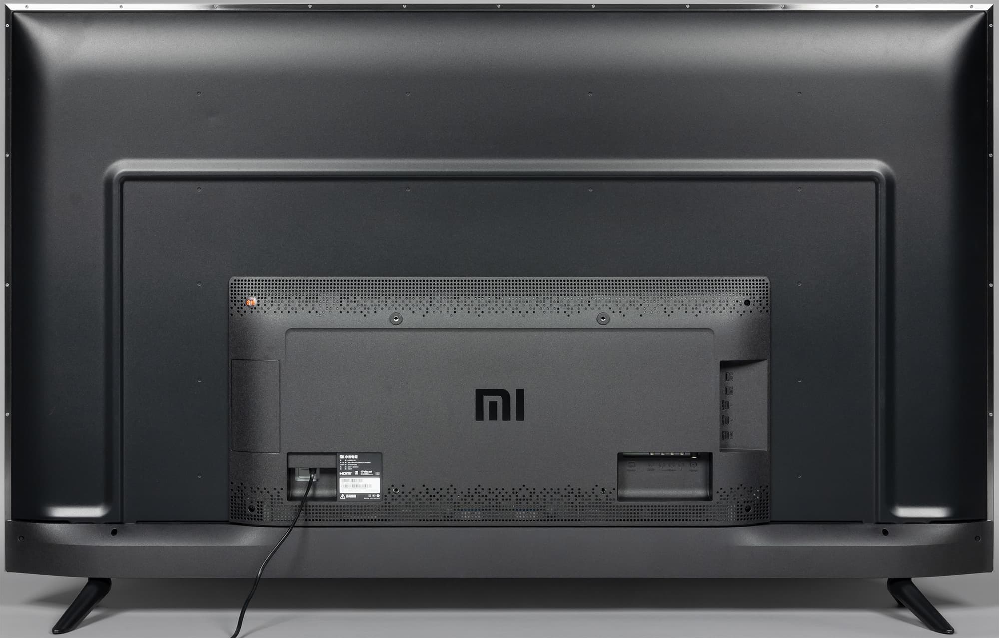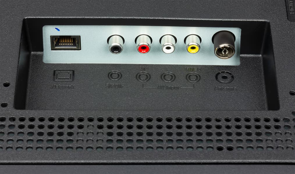 Альтернативный способ установки телевизора без использования штатных ножек — крепление телевизора на стену с помощью кронштейна под монтажные отверстия VESA 300 на 250 мм. Разъемы размещены в двух нишах на задней панели и ориентированы вниз и вбок. Провода, выходящие из ниши, которая ближе к центру, придется выгибать и выводить назад, что представляется крайне неудобным, особенно при монтаже ТВ на стене. Что помешало производителю сделать нишу незамкнутой или предусмотреть канал для кабелей, непонятно. Кабель питания неотсоединяемый, его длина 1,5 м (вилка китайская, с плоскими контактами).