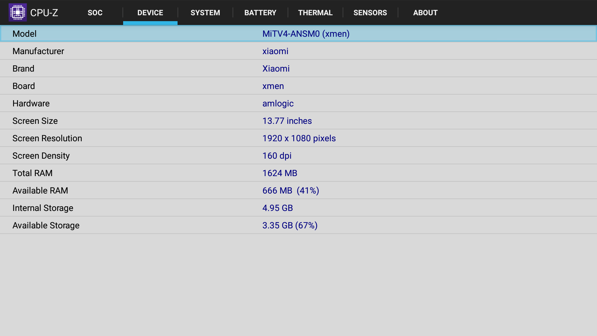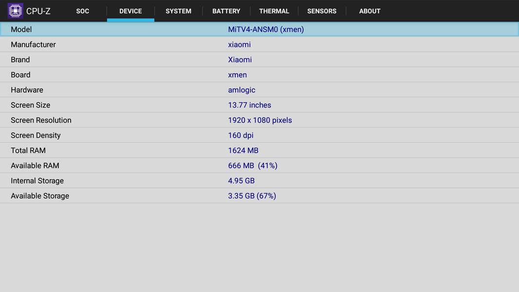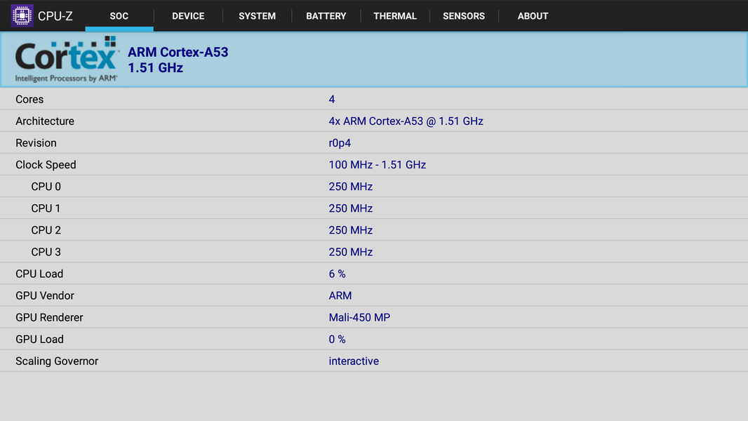 Программной платформой для этого ТВ служит ОС Android версии 6.0.1. Даже из режима ожидания включается ТВ долго, за 32 секунды, видимо, каждый раз система перезапускается заново, а не восстанавливается до предыдущего состояния. Аппаратную конфигурацию подсказывает программа CPU-Z: