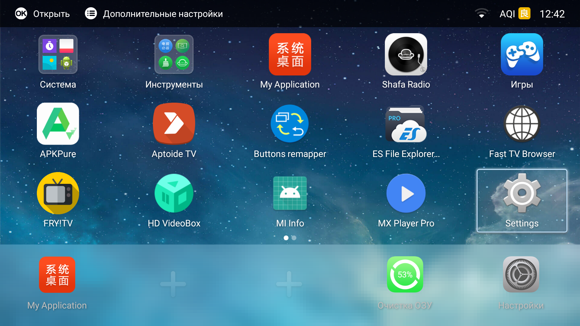 Впрочем, заботливый продавец не только приложил переходник с китайской вилки, но и установил на ТВ несколько альтернативных частично русифицированных лаунчеров и несколько полезных программ, в частности программу для доступа к системным настройкам, и программу, с помощь которой на кнопку [Домой] пульта был переназначен запуск альтернативного лаунчера. Российским пользователям это сильно повышает удобство работы с ТВ.