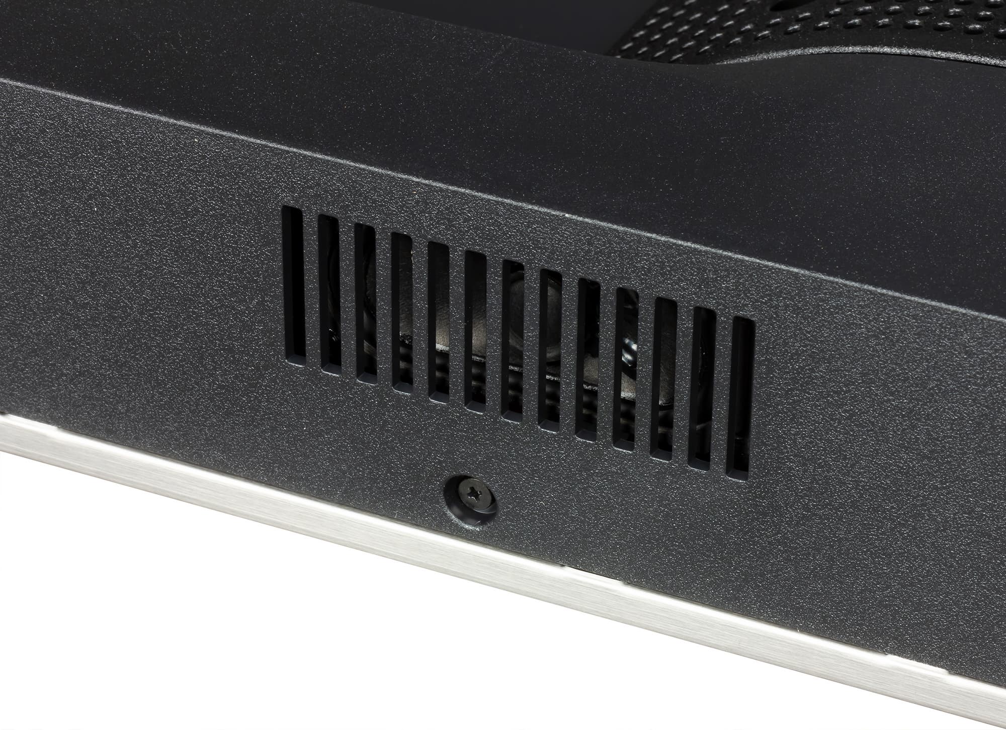 На центральном пластиковом кожухе сверху и снизу есть вентиляционные решетки. За двумя решетками на нижнем торце можно разглядеть громкоговорители с вытянутыми диффузорами.