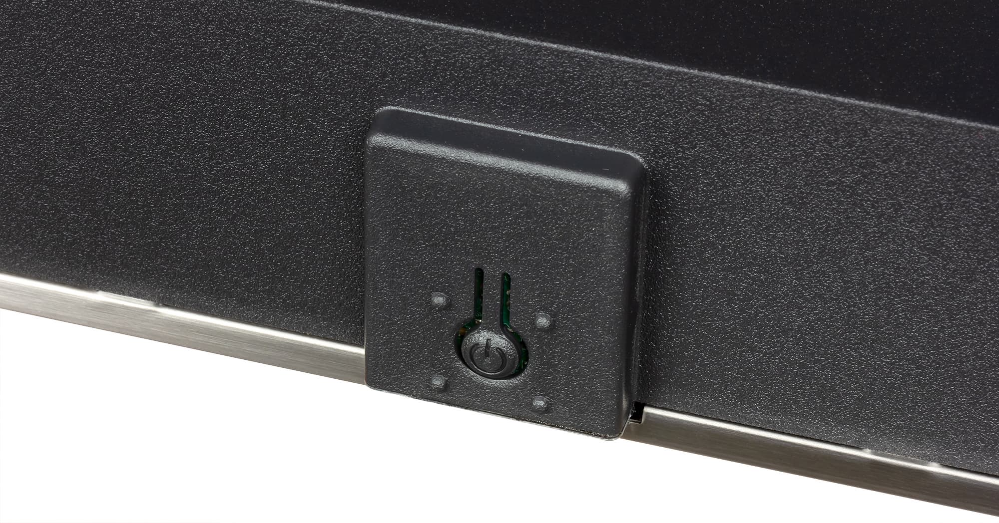 На нижнем торце по центру есть выступ с окошком спереди из прозрачного пластика. За окошком находятся индикатор состояния (мигает белым во время загрузки ТВ) и, видимо, ИК-приемник.