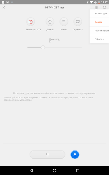 Функции координатного ввода, например, гироскопической мыши, у штатного пульта нет. Ограниченные в случае такого «умного» телевизора возможности пульта можно компенсировать, подключив к телевизору клавиатуру и мышь по USB и/или по Bluetooth. Эти устройства ввода работают через USB-разветвитель. Одновременно через разветвитель можно подключать и USB-накопители. Мышь и клавиатура работают в интерфейсе самого ТВ и в программах. Задержка перемещения курсора мыши относительно движения самой мышью небольшая, но все же чувствуется. Поддерживается прокрутка колесиком, а нажатие на правую кнопку мыши соответствует действию отмены или возврата. В случае клавиатуры поддерживаются некоторые быстрые клавиши из основного и дополнительного мультимедийного набора. Например, назад/отмена, переход на заглавную страницу, тише/громче и отключение звука, следующий/предыдущий файл, пауза/воспроизведение и стоп, вывод контекстного меню. Для смены раскладки на физической клавиатуре удобно использовать сторонние программы, например, Free Physical Keyboard. Неудобно, что не работает переключение между программами. Нужно отметить, что в целом интерфейс хорошо оптимизирован для использования только комплектного пульта ДУ, то есть подключать клавиатуру и мышь, в общем-то, необязательно.