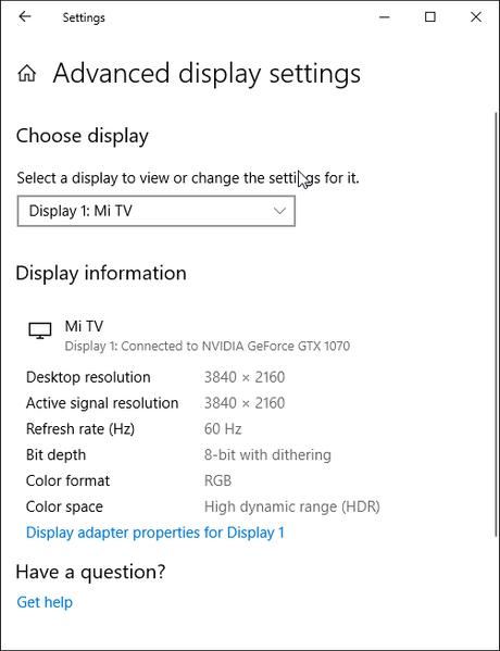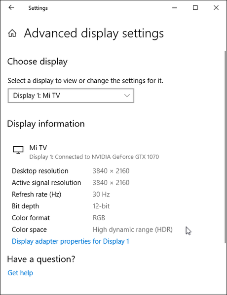 Под Windows 10 вывод в режиме HDR на данный телевизор возможен при выборе соответствующих опций в настройках дисплея. При разрешении 4К и 60 Гц вывод идет в режиме 8 бит на цвет, дополненных динамическим смешением цветов, видимо, с помощью видеокарты на аппаратном уровне. При 30 Гц — 12 бит на цвет: