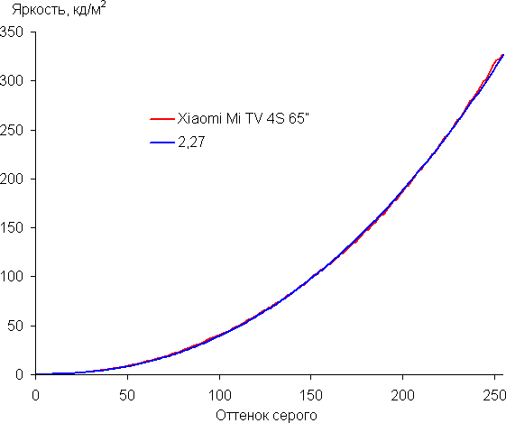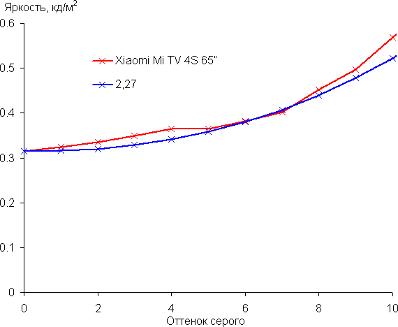 Аппроксимация полученной гамма-кривой дала показатель 2,27, что совсем немного выше стандартного значения 2,2, при этом реальная гамма-кривая слегка отклоняется от аппроксимирующей степенной функции: