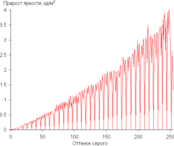 Для оценки характера роста яркости мы измерили яркость 256 оттенков серого (от 0, 0, 0 до 255, 255, 255). График ниже показывает прирост (не абсолютное значение!) яркости между соседними полутонами: