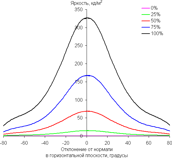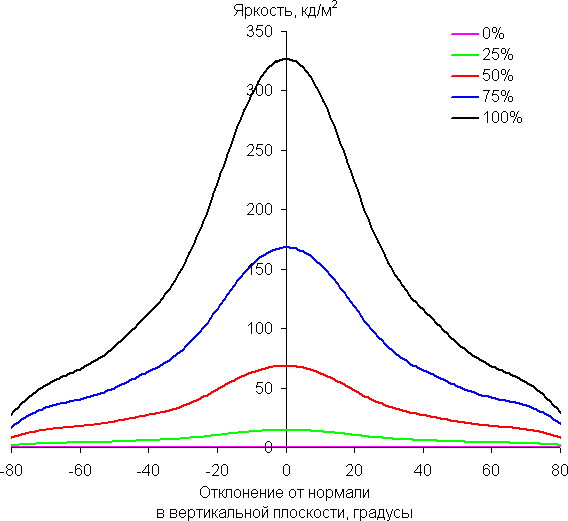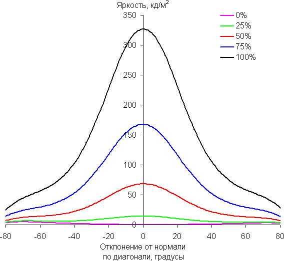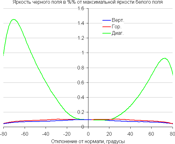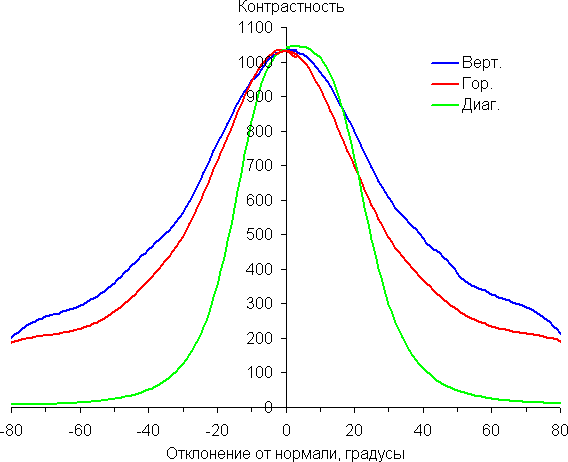 Отметим относительно плавное уменьшение яркости при отклонении от перпендикуляра к экрану во всех трех направлениях, при этом графики яркости полутонов не пересекаются во всем диапазоне измеряемых углов. При отклонении в диагональном направлении поведение яркости оттенков имеет промежуточный характер между вертикальным и горизонтальным направлениями, за исключением яркости черного поля, которая начинает резко возрастать уже при 20°-30° отклонения от перпендикуляра к экрану. Контрастность в диапазоне углов ±82° для двух направлений значительно превышает 10:1 и только для диагонального направления она ниже и по одной диагонали опускается за отметку 10:1 при 69°.