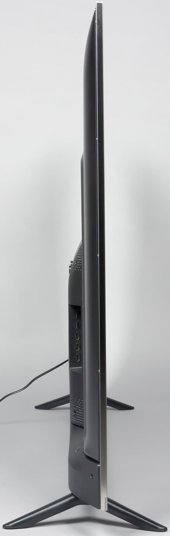 Штатная подставка состоит из двух пластиковых ножек галочкой. Опираются ножки на противоскользящие резиновые накладки. Телевизор стоит устойчиво и вертикально, но жесткость конструкции низкая, телевизор долго раскачивается от легкого толчка. Расстояние между опорами ножек примерно 1255 мм — на тумбу такой ширины телевизор можно поставить. Измеренная ширина корпуса равна 1453 мм — в нишу такой ширины ТВ поместится. Высота — с ножками 900 мм, без ножек — 840 мм.