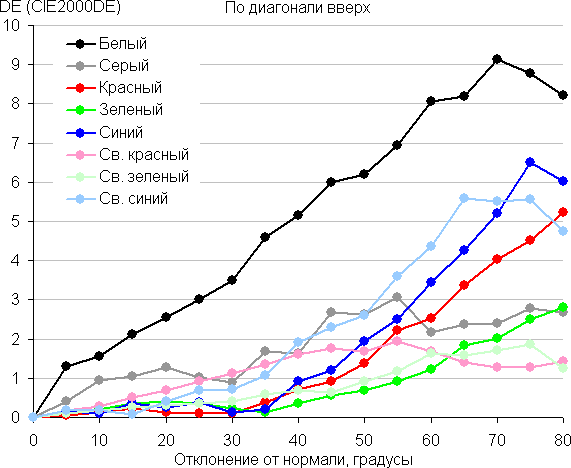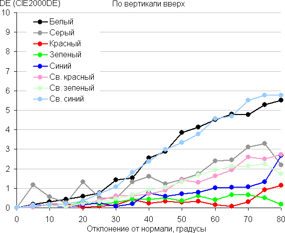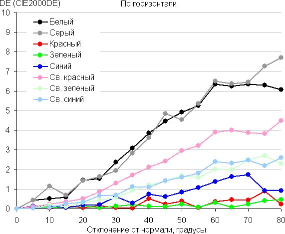 Для количественной характеристики изменения цветопередачи мы провели колориметрические измерения для белого, серого (127, 127, 127), красного, зеленого и синего, а также светло-красного, светло-зеленого и светло-синего полей во весь экран с использованием установки, подобной той, что применялась в предыдущем тесте. Измерения проводились в диапазоне углов от 0° (датчик направлен перпендикулярно к экрану) до 80° с шагом в 5°. Полученные значения интенсивностей были пересчитаны в отклонение ΔE относительно замера каждого поля при перпендикулярном положении датчика относительно экрана. Результаты представлены ниже: