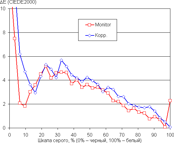 Самый близкий к черному диапазон можно не учитывать, так как в нем цветопередача не так важна, а погрешность измерения цветовых характеристик высокая. Цветовую температуру удалось приблизить к стандартным 6500 К, при этом ΔE на белом поле уменьшилась. При этом оба параметра мало изменяются от оттенка к оттенку на значимой части шкалы серого — это положительно сказывается на визуальной оценке цветового баланса.