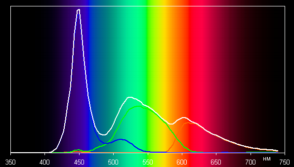 Такой спектр с относительно узким пиком синего и с широкими горбами зеленого и красного цветов характерен для мониторов, в которых используется белая светодиодная подсветка с синим излучателем и желтым люминофором.