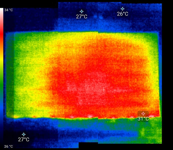 Нагрев телевизора можно оценить по приведенному изображению, сшитому из трех снимков с ИК-камеры, полученных после долговременной работы на максимальной яркости в помещении с температурой примерно 24 °C: