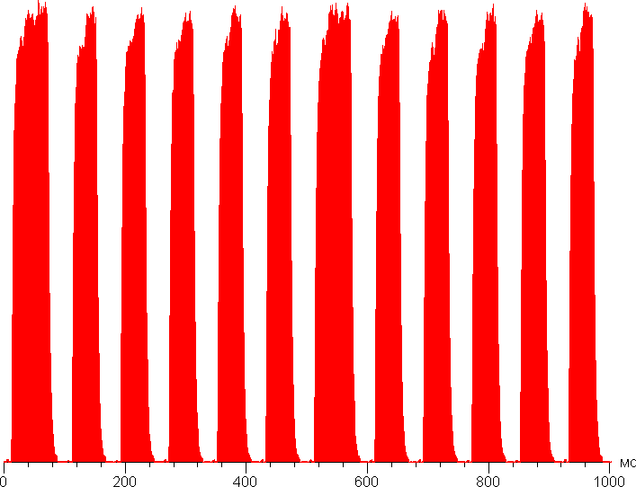 Кинотеатральные режимы работы тестировались при подключении к Blu-ray-плееру Sony BDP-S300. Использовалось HDMI-подключение. Телевизор поддерживает режимы 480i/p, 576i/p, 720p, 1080i и 1080p при 24/50/60 Гц. Цвета правильные, с учетом типа видеосигнала яркостная четкость высокая. Цветовая четкость немного ниже возможной. В стандартном для видео диапазоне (16—235) на шкале серого отображаются все градации оттенков (настройку Contrast лучше увеличить до 56). В случае режима 1080p при 24 кадр/с кадры выводятся с чередованием длительности 11 кадров по 2 и один по 3. То есть телевизор переходит в режим с частотой обновления 50 Гц. Медленная проводка в кино с 24 кадр/с выглядят плохо, так как замирание кадра раз в полсекунды глазом выявляется гораздо лучше, чем стробирование 2:3 при частоте обновления 60 Гц. Для иллюстрации приведем график, показывающий длительность кадров при последовательном выводе белого и черного кадров с частотой 24 кадр/с: