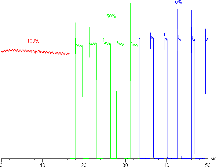 Частота модуляции относительно высокая, мерцание в принципе не может быть выявлено при обычном просмотре ТВ, но все же на средней и низкой яркости при быстром движении глаз или в тесте на стробоскопический эффект мерцание изображения может быть обнаружено.