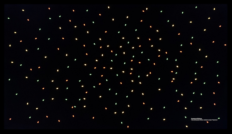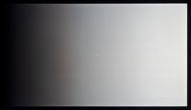 При выводе черного поля равномерность подсветки оказалась очень хорошей, без визуально выраженных дефектов однородности по полю матрицы, что подтверждает вторая фотография, сделанная с расстояния до экрана в 3 метра.