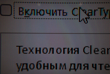 В связи с такой особенностью, так называемый кристаллический эффект фактически отсутствует, а экран визуально радует контрастной, насыщенной картинкой. Резкость достаточная (или слегка увеличенная в случае заводских настроек), проблем с выводом тонких линий и текстовых полей не отмечено. Вопросы к качеству отображения и плотности пикселей могут возникнуть только при просмотре ТВ с расстояния порядка 50—80 см (можете попробовать отключить ClearType, как на сравнительном примере выше). При увеличении дистанции до 1,2-1,5 метров и дальше картинка воспринимается плотной, без видимых дефектов.
