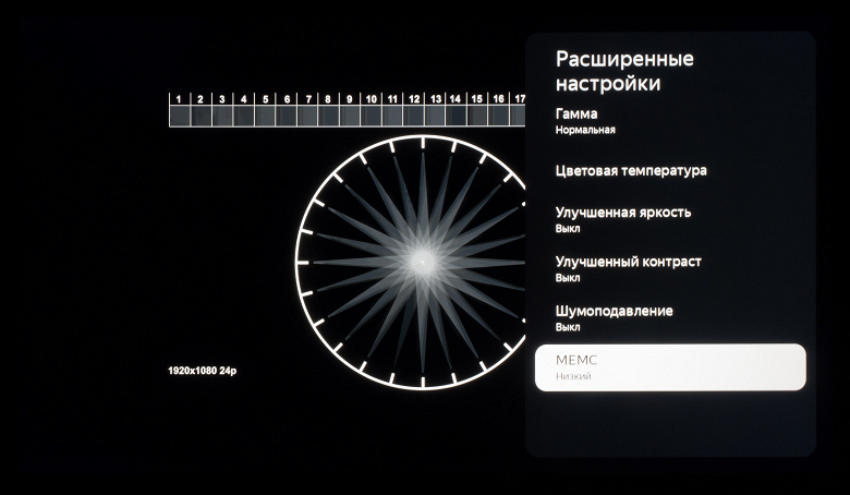 В расширенных опциях пользователь сможет найти несколько предустановок гаммы (отвечают за реальную контрастность картинки на экране), активацию шумоподавления (актуально для низкокачественного контента), включение функции генерации промежуточных кадров MEMC, динамические улучшения яркости и контрастности.