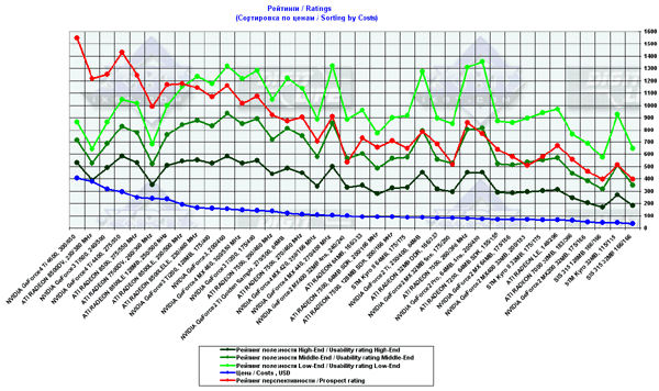 - сводные диаграммы по видеокартам стоимостью свыше $80 на базе стендов на Pentium 4 2100 MHz и Athlon XP 2000+.
