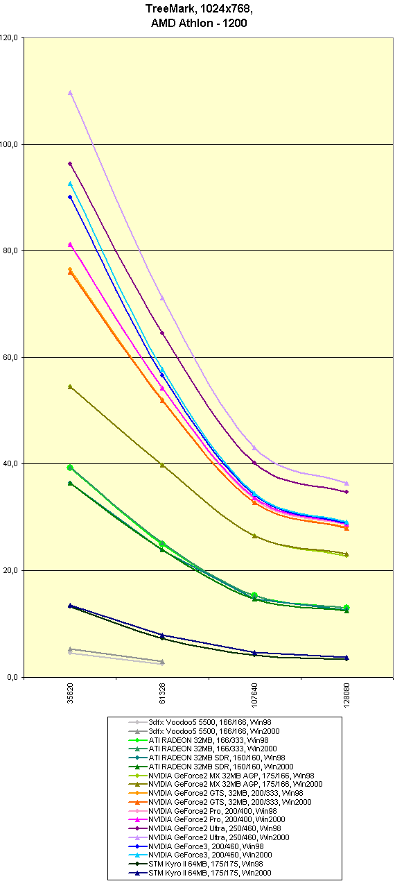 На диаграмме представлена зависимость производительности видеокарт от числа полигонов в сцене, то есть демонстрируется степень падения