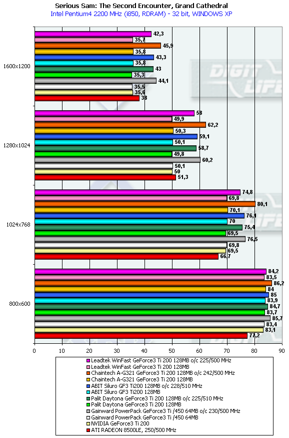 Картина полностью идентична. А также можно отметить, что в данном тесте, как и в предыдущем, RADEON 8500LE в низких разрешениях отстает от Ti 200, но в высоких уже серьезно опережает.