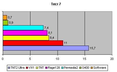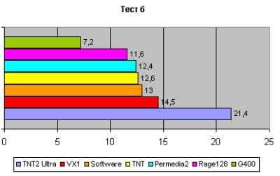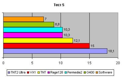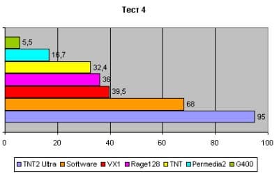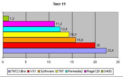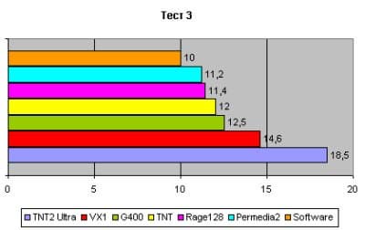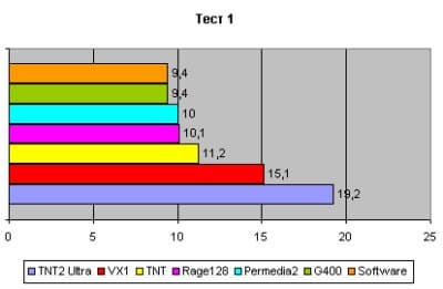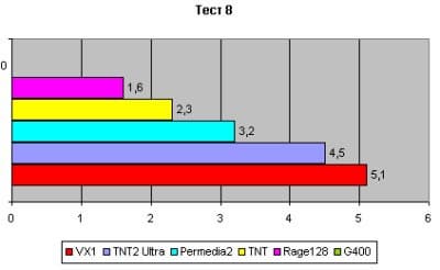 Как видно, плата на TNT2, помимо превосходных результатов в играх, лидирует среди недорогих плат и в пакете 3D Studio MAX. В 9 из 11 тестов эта плата заняла первые места, пропустив вперед плату Oxygen VX1 от 3Dlabs только в "Тест 8" и "Тест 9".