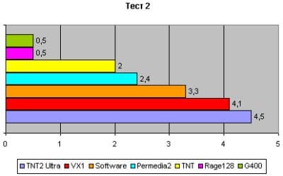 В этом тесте с умеренной нагрузкой на CPU с большим отрывом лидирует TNT2, VX1 серьезно отстает, остальные платы идут плотной группой и показывают такие же результаты, как софтверный рендерер.