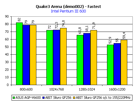 Этих инструментов вполне достаточно для того, чтобы показать производительность видеокарты. Для наглядности на диаграммах приведены скоростные показатели еще двух плат на GeForce 256 с памятью типа SDR SDRAM: ASUS AGP-V6600 и Gigabyte GA-GF2560. Также мы покажем работу видеокарты ABIT Siluro GF256 и при разгоне.