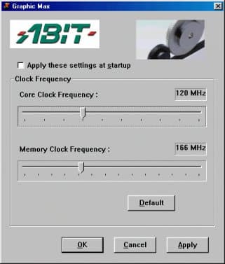 Прошу обратить внимание на то, что программисты из ABIT убрали из закладок драйверов возможность разгона, выпустив отдельную утилиту ABIT Graphics MAX: