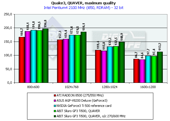 Этот весьма сложный тест продемонстрировал, что Ti 500 уже практически не является бескомпромиссным лидером, и в 1600х1200 его догнала карта на ATI RADEON 8500. А в остальном скорость платы от ABIT полностью соответствует производительности эталонной видеокарты на GeForce3 Ti 500.