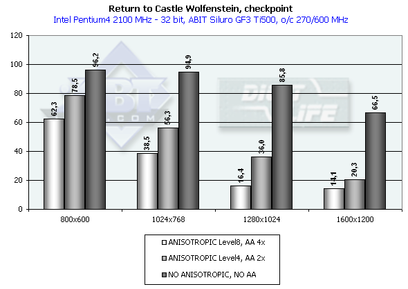 Мы уже много раз рассматривали работу анизотропной фильтрации в OpenGL у видеокарт класса GeForce3 и констатировали сильное падение производительности при активизации этой функции. Особенно это касается старших режимов (Level4 и 8). Еще одна функция — Anti-aliasing также много хочет "кушать", а ведь играть при активных обеих этих функциях — мечта многих геймеров. Поэтому давайте посмотрим, что происходит с играбельностью на примере той же игры (благо Return to Castle Wolfenstein имеет режим Single player), если мы включим эти функции на разогнанной карте ABIT Siluro GF3 Ti500.