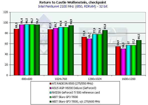 - Return to Castle Wolfenstein (id Software) — игровой тест, демонстрирующий работу платы в OpenGL с использованием демо-бенчмарка Checkpoint.