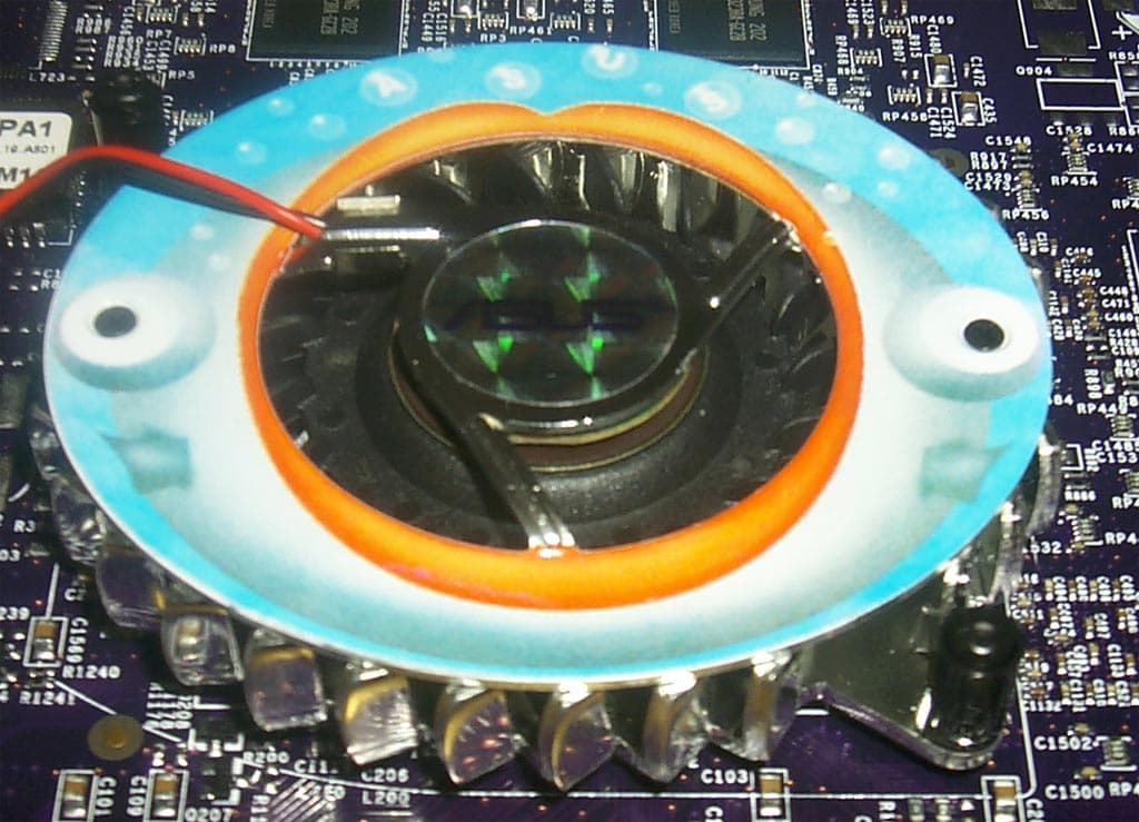 Обратите внимание на то, что изображено на радиаторе! :-) Интересно, о чем думали дизайнеры, когда нарисовали такую "рожу" с пастью, где вместо языка — ASUS? :-)