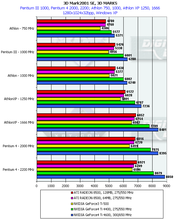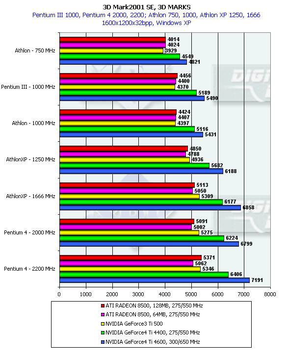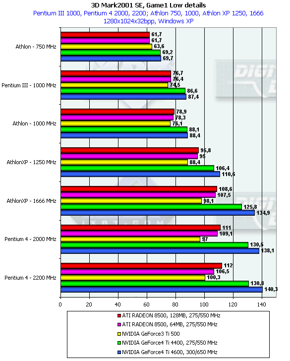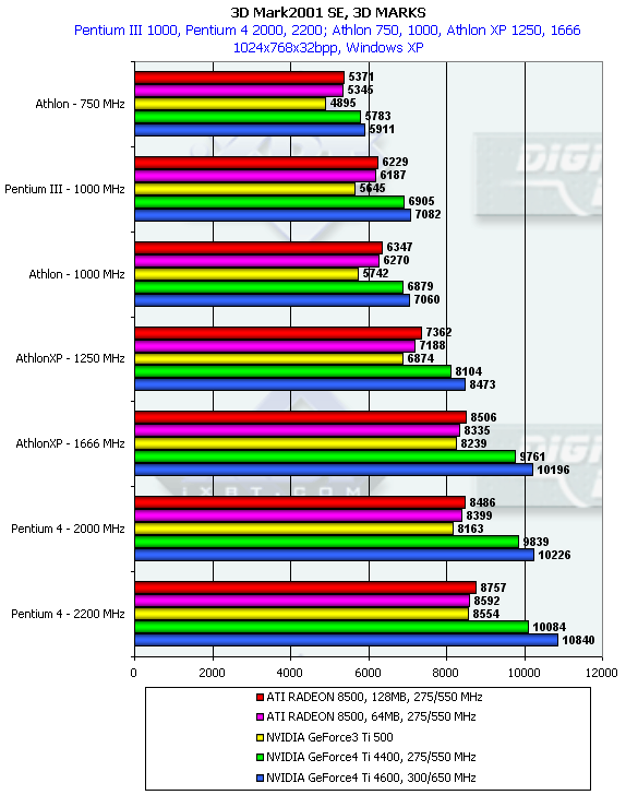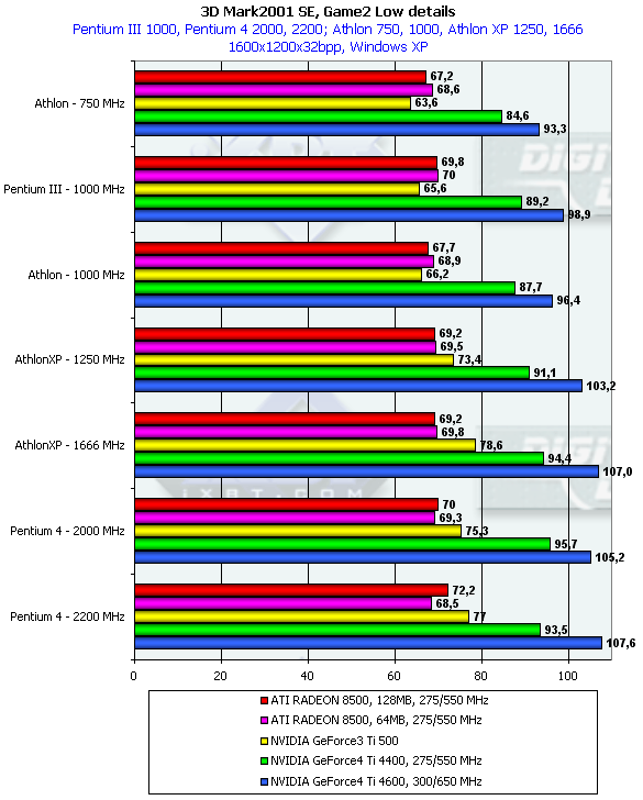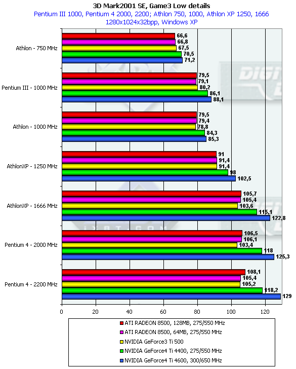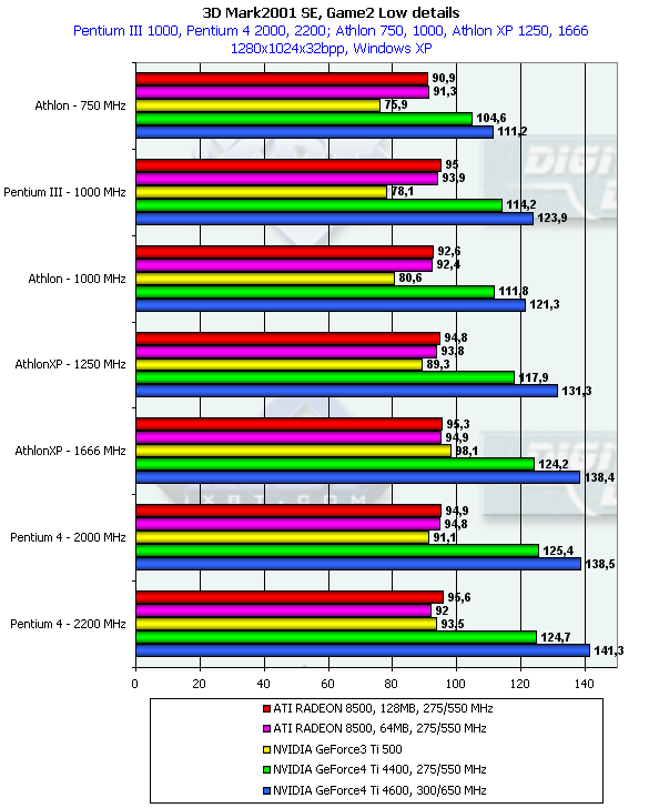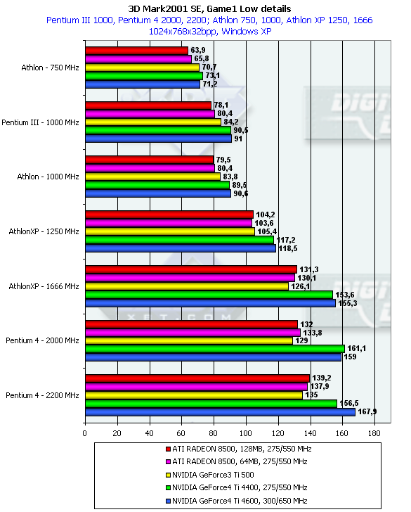 Однако данный тест является исключением из того правила, которое я выразил абзацем раньше. Можно заметить, что GeForce3 Ti 500 на младших процессорах уже обгоняет семейство RADEON 8500, тогда как на платформах с очень мощными CPU эта карта отставала. Что касается GeForce4 Ti, то очевидно, что приобретать такие карты владельцам систем с CPU менее 1.5ГГц — бесполезно (впрочем, об этом уже я говорил и ранее).