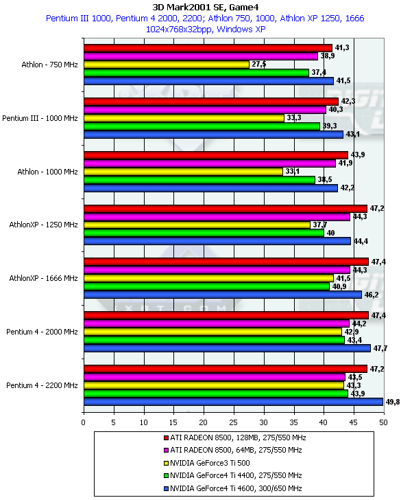 Как мы видим, эффективность по отсечению невидимых поверхностей у GeForce4 Ti и RADEON 8500 приводит к практически идентичным результатам на разных платформах.