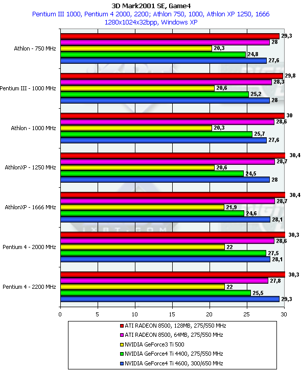 С Game4 все более сложно. Тут налицо и сильное влияние акселератора, и от процессора зависимость очень высока. Когда-то компания ATI поставила цель — поднять производительность в этом тесте, и она это сделала. Как мы видим, RADEON 8500 практически лидер (особенно 128-мегабайтный) в этой игре. Весьма сильная зависимость GeForce4 Ti 4600 от платформы и CPU не дает этой карте одержать победу над потенциально гораздо более слабым RADEON 8500 на маломощных системах. Однако маcштабируемость карт от NVIDIA свидетельствует о том, что на супер-быстрых системах они вырвутся вперед.